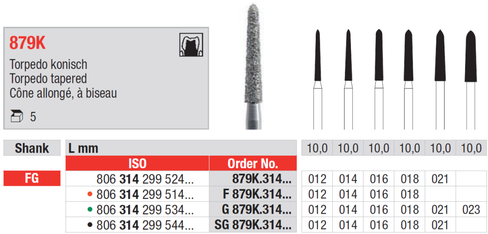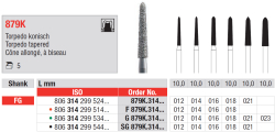Diamantový vrták s pracovnou časťou v tvare kužeľa so skoseným koncom (torpédo), 879K / F 879K červená / G 879K zelená / SG 879K čierna, mandrel FG, veľkosti 012 až 023.