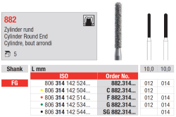 Diamantový vrták s pracovnou časťou v tvare valca so zaobleným koncom, 882 / C882 žltá / F 882 červená / G 882 zelená / SG 882 čierna, mandrel FG, veľkosti 012 a 014.