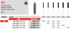 Diamantový vrták s pracovnou časťou v tvare valca so zašpicateným koncom, 885 / F 885 červená / G 885 zelená / SG 885 čierna, mandrel FG, veľkosti 008 a 018.