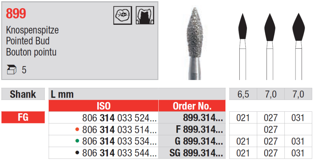 Diamantový vrták s pracovnou časťou v tvare plamienka, 899 / F 899 červená / G 899 zelená / SG 899 čierna, mandrel FG, veľkosť 021, 027 a 031. viac o produkte