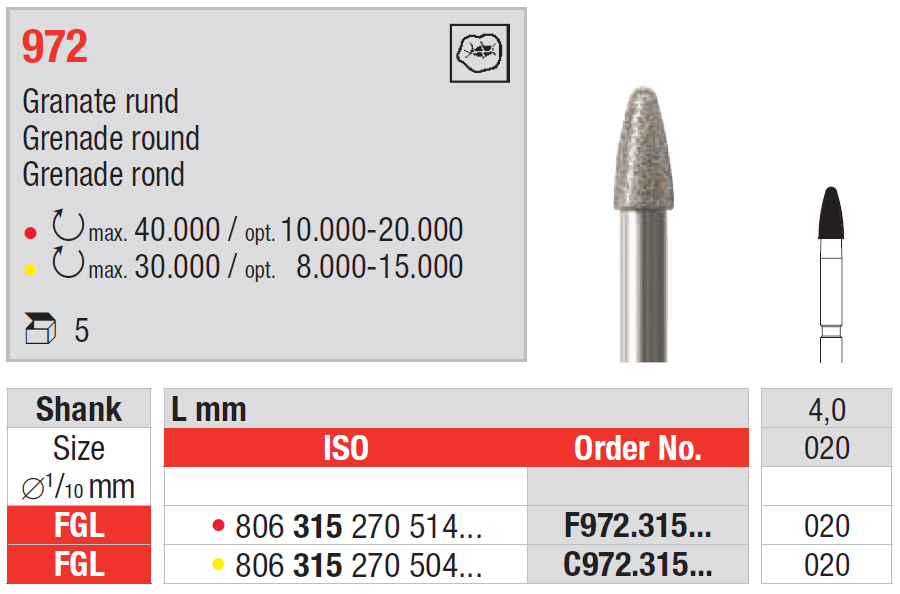 Okluzálny tvarovací nástroj C972/F972 je špeciálne vyvinutý na tvarovanie okluzálnych plôch a je vhodný pre všetky výplňové materiály, ako aj pre celokeramické ZrO2 materiály pre bezpečné formovanie hrbolčekov a fisúr len s jedným nástrojom. Okrúhly tvar uľahčuje tvarovanie hrbolčekov a fisúr. Zaoblenie zabraňuje zabrúseniu zárezov. Jemná a superjemná zrnitosť vytvára dokonalý povrch pre následné leštenie.