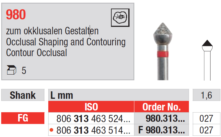 Diamantový vrták na okluzálne tvarovanie a kontúrovanie 980 / F 980 červená, mandrel FG, veľkosť 027. viac o produkte