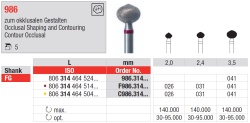 Diamantový vrták na okluzálne tvarovanie a kontúrovanie 986 / C 986 žltá / F 986 červená, mandrel FG, veľkosti 026, 031 a 041.