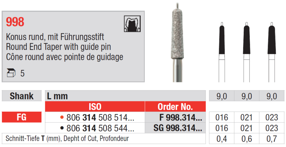 Diamantový vrták s pracovnou časťou v tvare kónusu s vodiacim kolíkom na špičke, F 998 červená / SG 998 čierna, mandrel FG, veľkosť 016, 021 a 023. viac o produkte