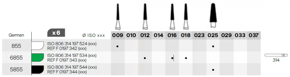Diamantový vrtáčik s frézou v tvare dlhého kužeľa so zaobleným koncom, FG, priemer 009-025. Balenie 6 ks.