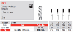Vrtáčik z karbidu volfrámu s valcovitou reznou časťou, C21 kratšie (C21L dlhšie výpredaj), veľkosti 010 až 016, mandrely RA (výpredaj HP).