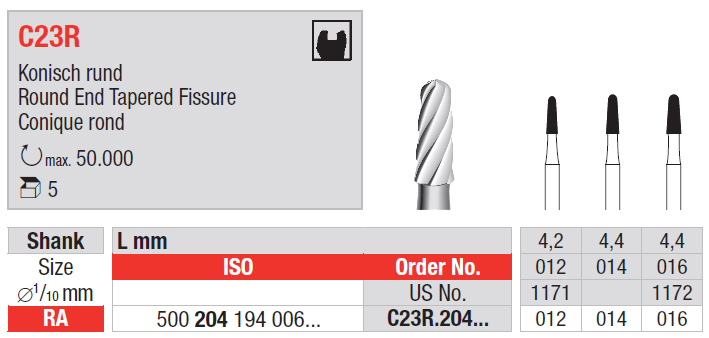 Vrtáčik z karbidu volfrámu so zaobleným koncom a zužujúcou sa reznou časťou, C23R, veľkosti 010 až 016, mandrely RA (výpredaj C23RS FG 009).