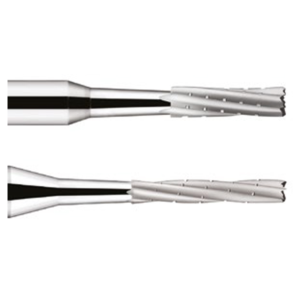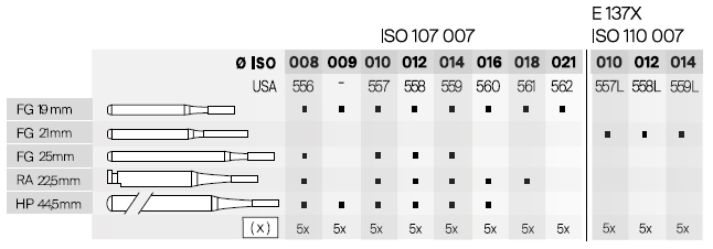 Vrtáčik E0137 na kavity z karbidu wolfrámu s frézovacou korunkou v tvare valca so zrezaným koncom a s vrúbkami (Cylinder Square) s 5 symetrickými reznými hranami. 2 dĺžky frézovacích koruniek (0137, 137X). Mandrely FG/RA/HP, dĺžky 19 až 44,5 mm. Balenie po 5 kusov.