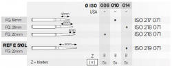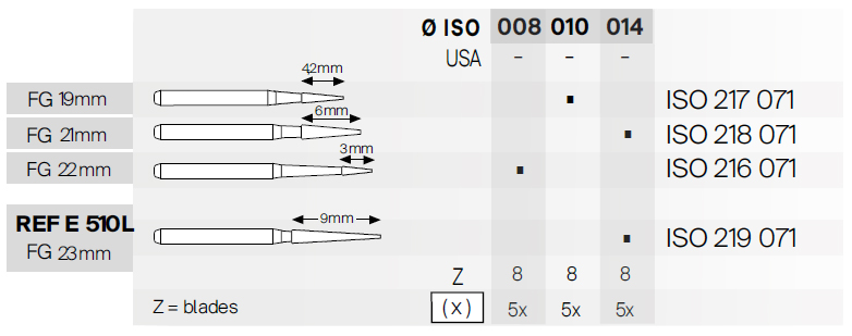 Vrtáčik – frézka E0510 z karbidu volfrámu na úpravy a dokončovanie s frézovacou korunkou v tvare kužeľa s rovnými reznými hranami, priemer ISO 008-014, 8 symetrických rezných hrán, mandrel FG, dĺžka 19, 21, 22 a 23 mm, balenie 5 kusov.