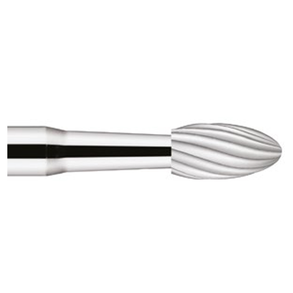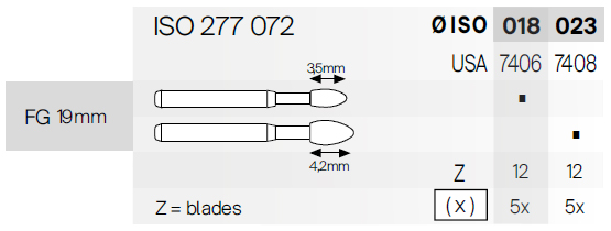 Vrtáčik – frézka E0512 z karbidu volfrámu na úpravy a dokončovanie s frézovacou korunkou v tvare vajíčka, priemer ISO 018/023, 12 symetrických rezných hrán, mandrel FG, dĺžka 19 mm, balenie 5 kusov.