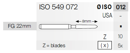 Vrtáčik – frézka E0515 z karbidu volfrámu na úpravy a dokončovanie s frézovacou korunkou v tvare valca, priemer ISO 012, 10 symetrických rezných hrán, mandrel FG, dĺžka 22 mm, balenie 5 kusov.