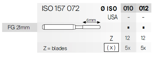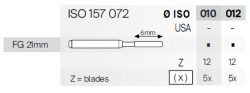 Vrtáčik – frézka na úpravy a dokončovanie v tvare valca s hranatým koncom, priemer ISO 010 a 012, mandrel FG, dĺžka 21 mm, balenie 5 kusov.