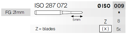 Vrtáčik – frézka E0524 z karbidu volfrámu na úpravy a dokončovanie s frézovacou korunkou v tvare valca so špicatým hrotom, ISO 287 072, priemer ISO 009, 8 symetrických rezných hrán, mandrel FG, dĺžka 21 mm, balenie 5 kusov.