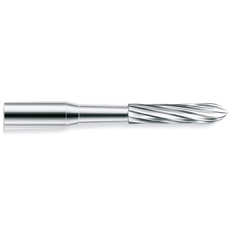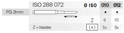 Vrtáčik – frézka E0526 z karbidu volfrámu na úpravy a dokončovanie s frézovacou korunkou v tvare valca so špicatým koncom, ISO 288 072, priemer ISO 010/012, 8 resp. 10 symetrických rezných hrán, mandrel FG, dĺžka 21 mm, balenie 5 kusov