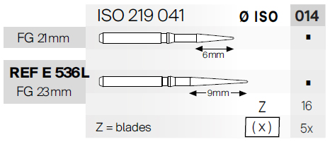 Vrtáčik – frézka E0536 z karbidu volfrámu na úpravy a dokončovanie s frézovacou korunkou v tvare kužeľa, ISO 219 041, priemer ISO 014, 16 symetrických rezných hrán, mandrel FG, dĺžka 21 a 22 mm, balenie 5 kusov