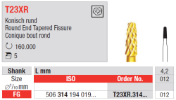 Vrták z kardbidu volfrámu v tvare kónusu s oblým koncom, na odstraňovanie cementu, veľkosť 012 (výpredaj 016), mandrel FG. Frézy z karbidu volfrámu FG na ľahké odstránenie amalgámu a kompozitu. Špeciálna úprava povrchu zaručuje optimálny úber materiálu a zabraňuje zaneseniu nástrojov. Veľké časti výplní sa odstránia rýchlo a bez zvýšenia teploty.