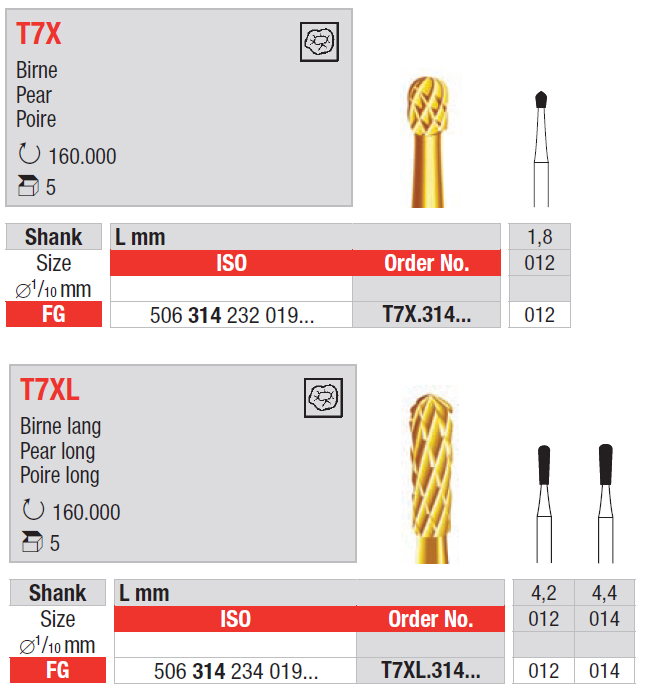 Vrtáky z karbidu volfrámu hruškovitého tvaru na odstraňovanie amalgámu, T7X kratší / T7XL dlhší, veľkosti 012 a 014, mandrel FG.