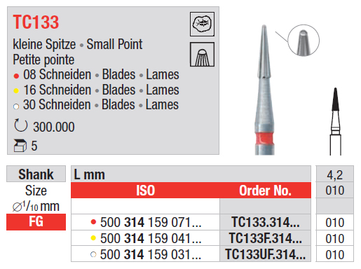 Finírovací vrták z karbidu volfrámu v tvare kónusu s bezpečnostným zakončením, malý, červená TC133, žltá TC133F, biela TC133UF, veľkosť 010, mandrel FG.