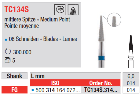 Finírovací vrták z karbidu volfrámu v tvare kónusu s bezpečnostným zakončením, stredný, červená TC134, žltá TC133F, biela TC134UF, modrá TC134S, veľkosť 014, mandrel FG.