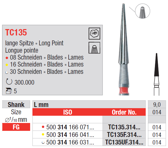 Finírovací vrták z karbidu volfrámu v tvare kónusu s bezpečnostným zakončením, dlhý, červená TC135, žltá TC135F, biela TC135UF, modrá TC135S, veľkosť 014, mandrel FG.