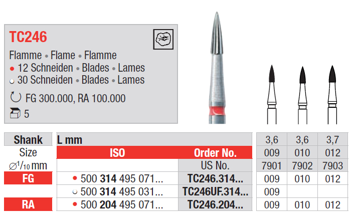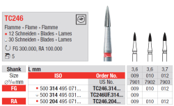 Finírovací vrták z karbidu volfrámu v tvare plamienka, červená TC246, biela TC246UF, veľkosť 009 až 012, mandrel FG/RA.