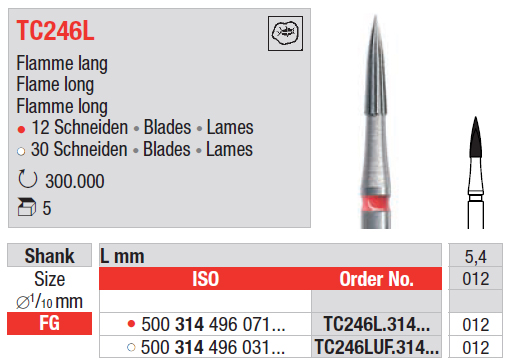 Finírovací vrták z karbidu volfrámu v tvare dlhého plamienka, červená TC246L, biela TC246LUF, veľkosť 012, mandrel FG. viac o produkte