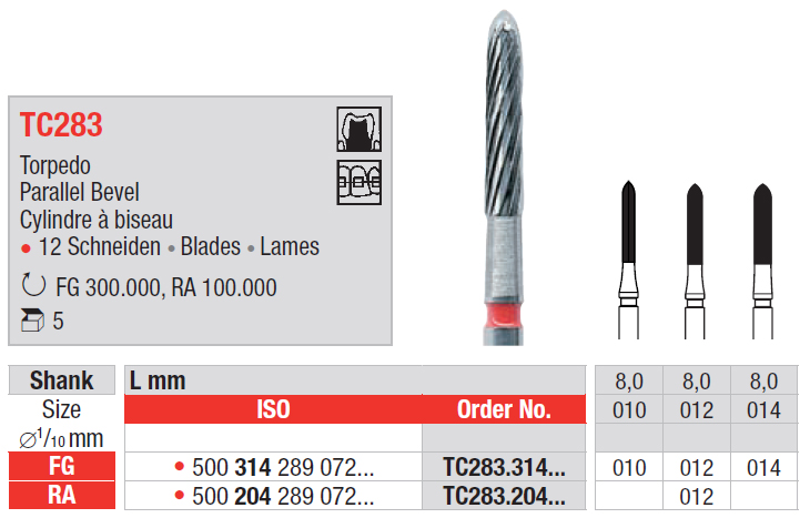 Finírovací vrták z karbidu volfrámu v tvare torpéda, červená, veľkosti 010 až 014, mandrel FG/RA. viac o produkte