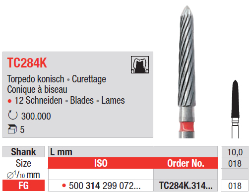 Finírovací vrták z karbidu volfrámu v tvare torpéda na kyretáž, červená, veľkosť 018, mandrel FG. viac o produkte