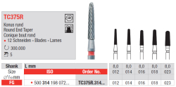 Finírovací vrták z karbidu volfrámu v tvare kónusu so zrezaným, plochým zakončením, červená, veľkosti 012 až 023, mandrel FG.
