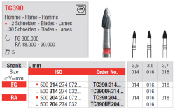 Finírovací vrták z karbidu volfrámu v tvare plamienka, červená TC390, biela TC390UF, modrá TC390S, veľkosť 014 až 018, mandrel FG/RA.