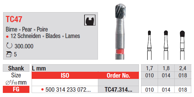 Vrtáky z karbidu volfrámu hruškovitého tvaru na odstraňovanie amalgámu, T7X kratší / T7XL dlhší, veľkosti 012 a 014, mandrel FG.