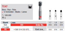 Vrtáčik z karbidu volfrámu s hruškovitou reznou časťou Pear, kratšie C7 (výpredaj) alebo dlhšie C7L, C7XL (výpr.), veľkosti 006 až 012, mandrely HP/RA.